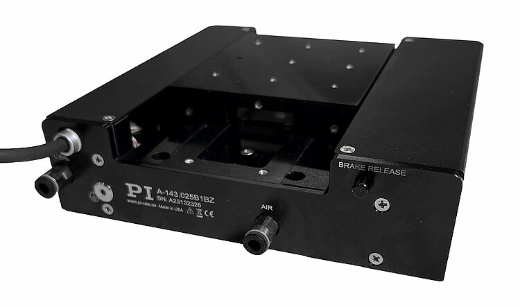 PIglide miniature linear stage with air bearings; ironless 3-phase linear motor; 25 mm travel range; 40 N load capacity; 390 mm/s maximum velocity; absolute linear encoder, 1 nm sensor resolution, BiSS-C; electromagnetic holding brake; pneumatic counterbalance; 0.5 m cable length