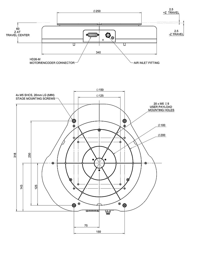 Note on the permissible push force: Assumes an operating pressure of 480 kPa of the air bearings. The stage is designed for horizontal operation only.