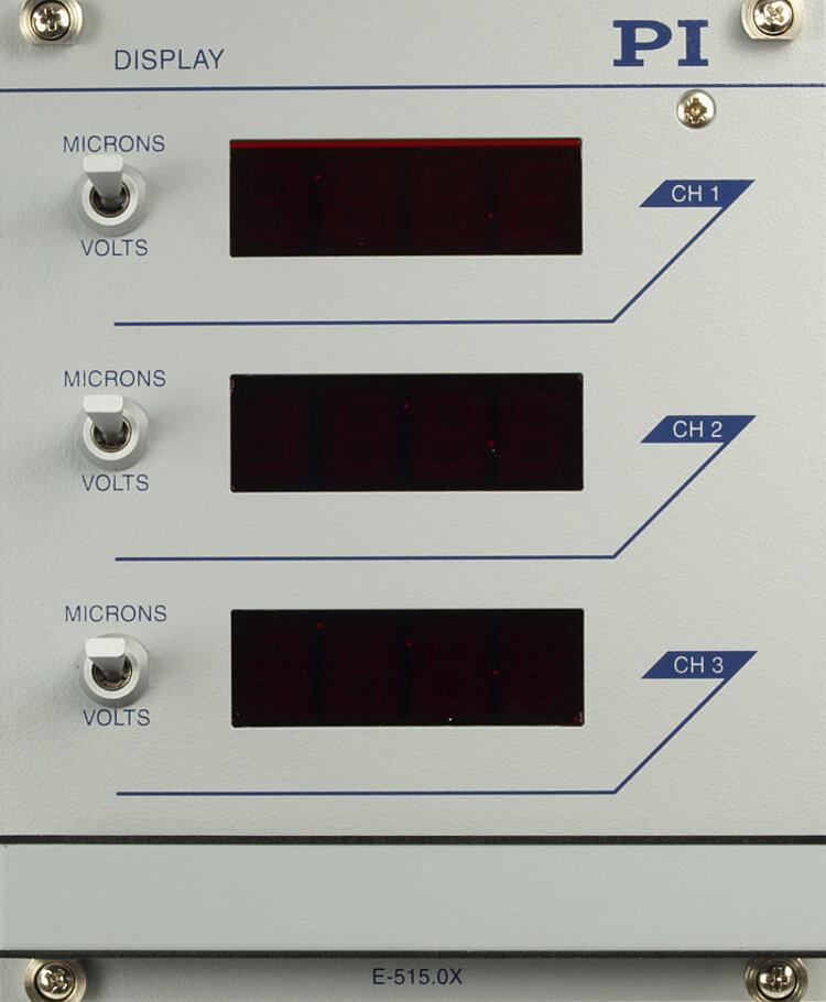 E-500 / E-501 Series Modular Piezo Controller: Chassis with power supply, amplifier modules (E-503, E-504, E-505, E-506, E-508), sensor and servo-control module (E-509), display and interface modules (E-515, E-517).