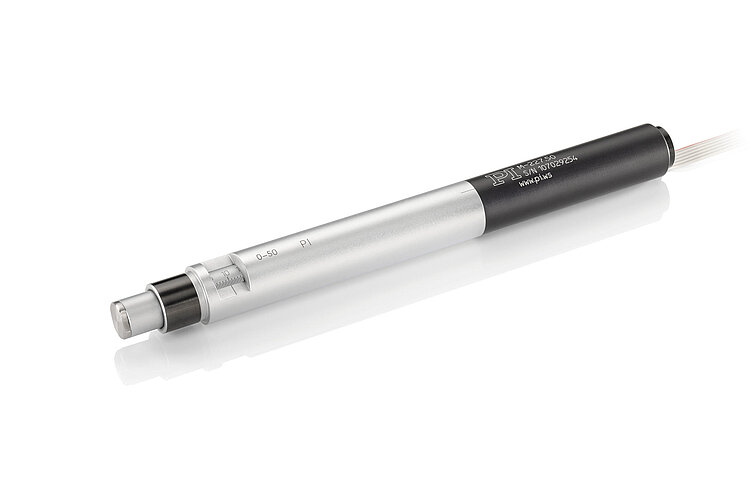 High-resolution linear actuator with DC motor; DC gear motor; 25 mm travel range; 40 N feed force; 0.75 mm/s maximum velocity; trapezoidal-threaded spindle; incremental rotary encoder, 2048 counts/rev. sensor resolution; 0.1 m cable length