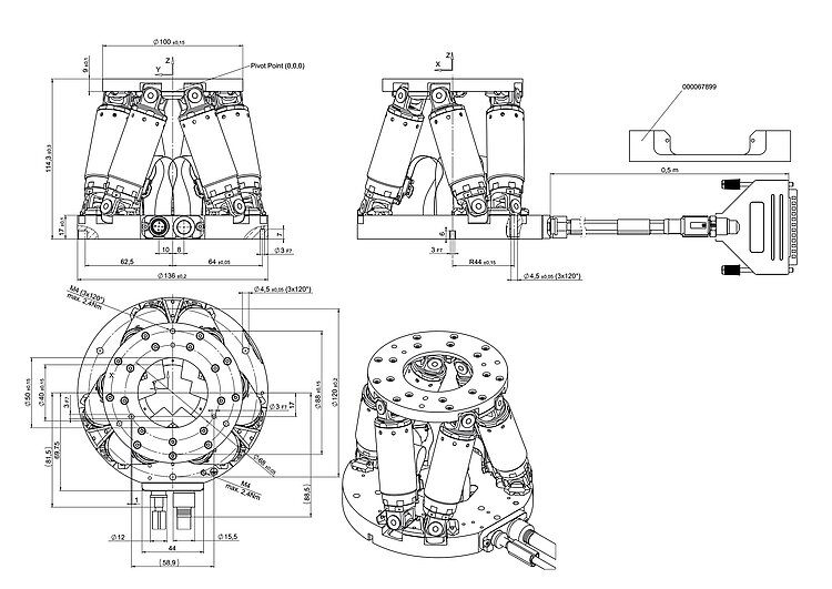 Miniature hexapod; BLDC motor; 5 kg payload; 20 mm/s maximum velocity; 0.5 m cable length. Connecting cables are not included in the scope of delivery and must be ordered separately.