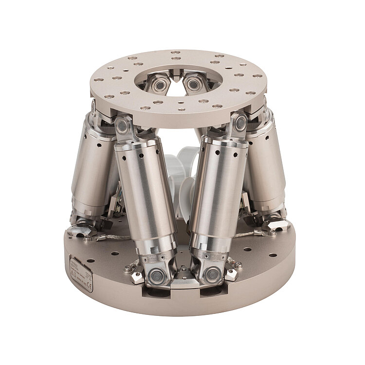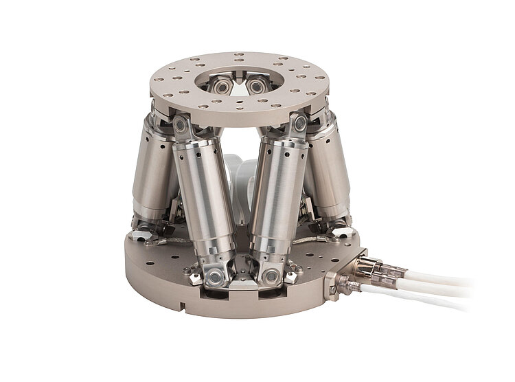 Miniature hexapod; BLDC motor; vacuum compatible to 10-6hPa; 5 kg payload; 10 mm/s velocity; 2 m cable length (vacuum side); feedthroughs. Air-side connecting cables are not included in the scope of delivery and must be ordered separately.