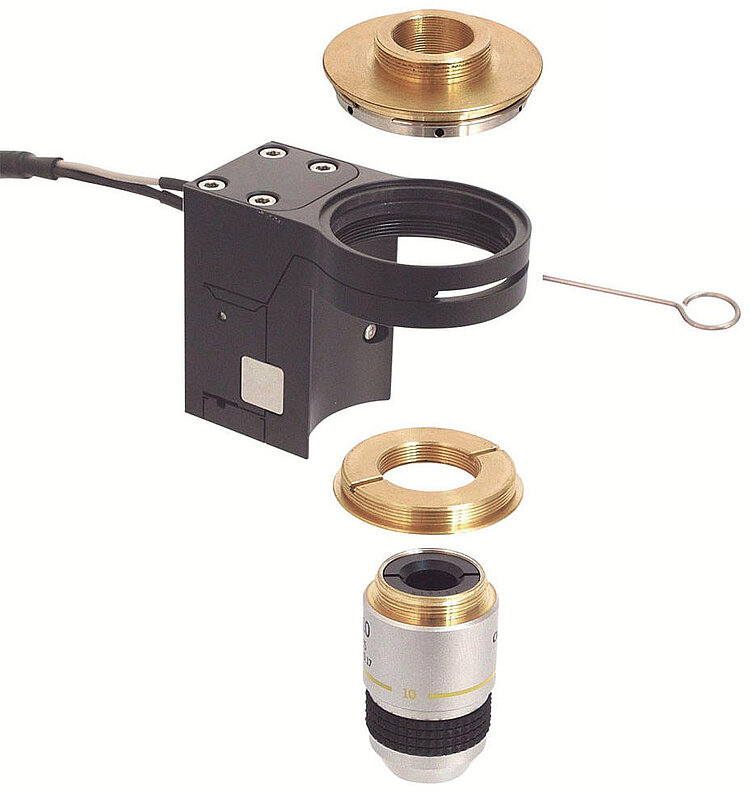The PIFOC objective positioners are inserted with the thread adapters between the microscope's revolving nosepiece and objective. After the adapter has been screwed into the revolving nosepiece, the PIFOC positioner is orientated as desired and fixed to the adapter. It is not necessary to turn the PIFOC positioner while doing this, which simplifies cable routing.